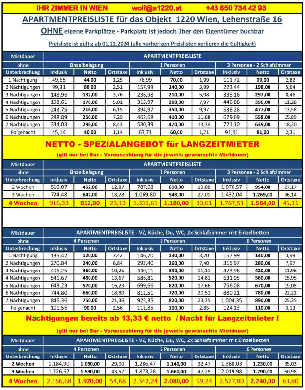 Die angeführten Preise sind reine Nächtigungspreise inklusive der Energiekosten, TV und Internetsowie der wöchentlichen Grundreinigung, jedoch ohne jede weitere Dienstleistung.Es gelten die Allgemeinen Geschäftsbedingungen (AGBH 2006), diese werden auf Verlangen gerne ausgefolgt,beziehungsweise sind diese auf unseren Homepages einsehbar. Irrtum und Druckfehler vorbehalten.Gerichtsstand ist Wien.